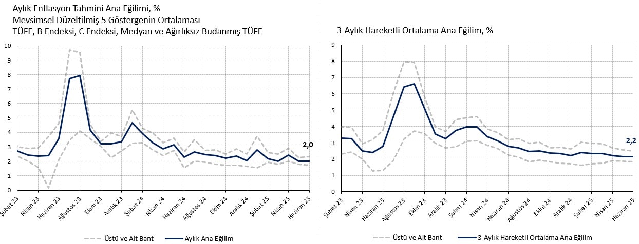 Enflasyonun genel gidişatına dair uç değerler, oynaklıklar ve mevsimsellikten arınmış bir özet gösterge oluşturmak adına 5 mevsimsel düzeltilmiş göstergenin ortalamasını (TÜFE, çekirdek B ve C endeksleri, medyan, ağırlıksız ortalama budanmış TÜFE) alıyoruz. Haziran ayı için, söz konusu tahmini ana eğilim aylık %2,0 (Mayıs %2,0, Nisan %2,6, Mart %2,1) ile önceki aya göre yatay seyrediyor. Tahmini ana eğilimin 3-aylık hareketli ortalaması da %2,2 (Mayıs %2,2, Nisan %2,3, Mart %2,4, Şubat %2,4) ile yatay kalıyor. Son aylarda ana eğilimin %2’nin altına inmekte zorlandığını görüyoruz.