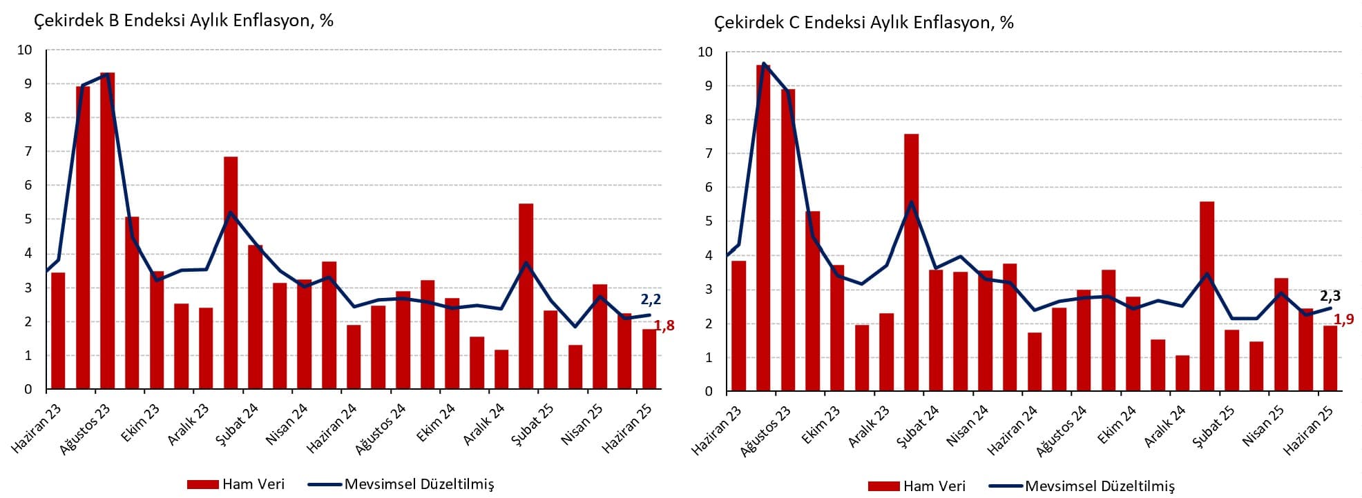 Özel kapsamlı çekirdek göstergelerden işlenmemiş gıda, enerji, alkollü içecek, tütün ürünleri ve altın fiyatlarını hariç tutan özel kapsamlı B endeksi aylık %1,8, farklı olarak tüm gıdayı dışlayan C endeksi aylık %1,9 seviyesinde. Mevsimsel düzeltilmiş B endeksini %2,2 (Mayıs %2,1, Nisan %2,7, Mart %1,8), C endeksini %2,3 (Mayıs %2,2, Nisan %2,9, Mart %2,1) düzeyinde hesaplıyoruz. İki seride de önceki aya göre sınırlı bir bozulma görülüyor.