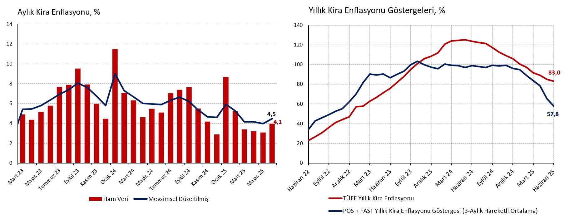 TÜFE sepetindeki 143 temel başlığın medyan enflasyonu ham veride aylık %1,24 gibi gerçekten düşük bir seviyede. Ancak mevsim etkisinden arındırdığımızda %1,7 (Mayıs %1,9, Nisan %2,2, Mart %1,9) civarında hesaplıyoruz. Benzer şekilde 143 alt kalemin budanmış ağırlıksız ortalaması ham veride %1,4 iken mevsimsel düzeltilmiş rakam %1,8 (Mayıs %1,8, Nisan %2,0, Mart %1,8) düzeyinde yatay seyrediyor.