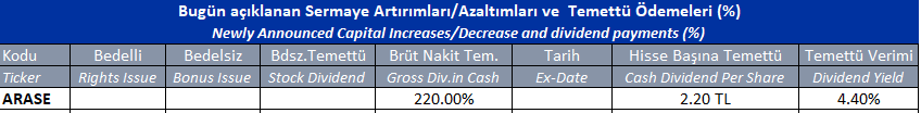 Gün içinde çıkmış veya bu sabah seans açılmadan önce açıklanmış sermaye artırımları ve temettü ödemeleri aşağıdaki tabloda görüntülenmektedir