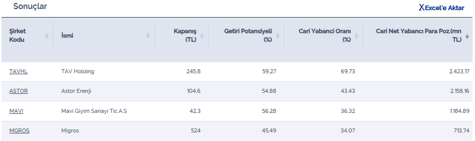 En az %45 getiri potansiyeli olan, yabancı oranı yüksek ve kasasında döviz bulunan şirketler listesini aşağıda inceleyebilirsiniz.