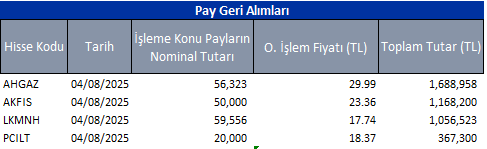 Pay geri alım programları kapsamında ilgili tarihte geri alım yapan şirketlerin listesini aşağıdaki tabloda bulabilirsiniz.