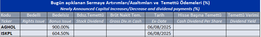 Gün içinde çıkmış veya bu sabah seans açılmadan önce açıklanmış sermaye artırımları ve temettü ödemeleri aşağıdaki tabloda görüntülenmektedir.