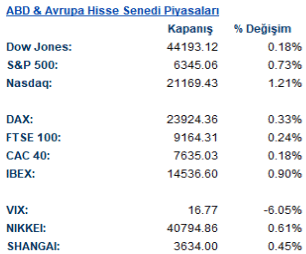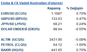 Emtia tarafında, Ons Altın (COMEX) günü %0.05’lik sınırlı bir düşüşle 3,432.90 dolar seviyesinden tamamlarken, Ons Gümüş (COMEX) %0.28’lik bir artışla 37.93 dolardan alıcı buldu. WTI Petrol (CLQ5) %1.69’luk bir düşüşle 64.06 dolardan günü tamamladı. Brent Petrol, %1.54’lük bir değer kaybıyla varil başına 66.60 dolara geriledi. Londra Metal Borsası’nda (LME) endüstriyel metaller pozitif bir seyir izledi; LME Alüminyum %1.81 artışla 2,609 dolar, LME Çinko %1.11 artışla 2,788.5 dolar ve LME Bakır %0.39 artışla 9,676 dolar seviyesinden işlem gördü.