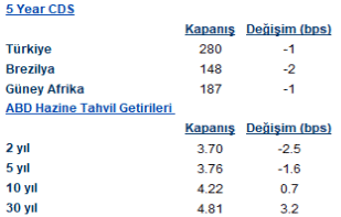 ABD tahvil piyasalarında, Fed yetkililerinin ekonomide bir “dönüm noktasına” işaret eden ve yakın vadede faiz indirimini gündeme getiren açıklamalarıyla kısa vadeli getirilerde düşüş yaşandı. 42 milyar dolarlık 10 yıllık Hazine tahvili ihracına piyasanın tepkisi sınırlı kalırken, kısa vadeli faiz beklentilerindeki gevşeme tahvil eğrisini etkiledi. Avrupa tarafında ise getirilerde yükseliş gözlendi; Almanya’nın 10 yıllık tahvil getirisi 3 baz puan, İngiltere’nin 10 yıllık tahvil getirisi ise 1 baz puan artış gösterdi. Gelişmekte olan ülkelere yönelik risk algısında hafif bir iyileşme gözlendi. Türkiye’nin 5 yıllık CDS primi 1 baz puan düşerek 280 seviyesine, Brezilya’nın CDS’i 2 baz puan düşerek 148 seviyesine ve Güney Afrika’nın CDS’i 1 baz puan düşerek 187 seviyesine geriledi. ABD Hazine tahvil getirilerinde ise kısa vadede düşüşler dikkat çekti. 2 yıllık tahvil getirisi 2.5 baz puan azalarak %3.70’e, 5 yıllık tahvil getirisi 1.6 baz puan azalarak %3.76’ya düştü. Uzun vadede ise hafif bir yükseliş vardı; 10 yıllık getiri 0.7 baz puan artışla %4.22’ye, 30 yıllık getiri ise 3.2 baz puan artışla %4.81’e yükseldi.