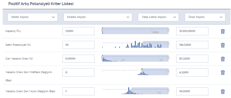 Burada yer alan fiyatlar, veriler ve bilgilerin tam ve doğru olduğu garanti edilemez. Hesaplamalarda doğru olduğu düşünülen, genel kabul görmüş formüller tüm şirketler için kullanılmıştır. Şirket özelinde tek seferlik gelir/gider kalemleri ihtiva eden, farklı hesaplama yapılması gereken şirketlerde farklılıklar görülebilir. Hesaplamalar farklı kaynaklar ile karşılaştırıldığında değişik sonuçlar görülebilir. Veriler İş Yatırım Menkul Değerler A.Ş. tarafından güvenilir olduğuna inanılan kaynaklardan alınmıştır. Hesaplamalarda kullanılan verilerin ve hesaplanan değişkenlerin doğruluğu garanti edilemez. Yapılacak filtremeler sonucu ulaşılacak sonuçlar herhangi bir yatırım aracının alım-satım önerisi ya da getiri vaadi olarak yorumlanmamalıdır. Bu sonuçlara dayanarak yatırım kararı verilmesi beklentilerinize uygun sonuçlar doğurmayabilir. Hesaplamalarda veya teknoloji farklılıkları nedeni ile ortaya çıkabilecek hatalardan İş Yatırım Menkul Değerler A.Ş. sorumlu değildir.