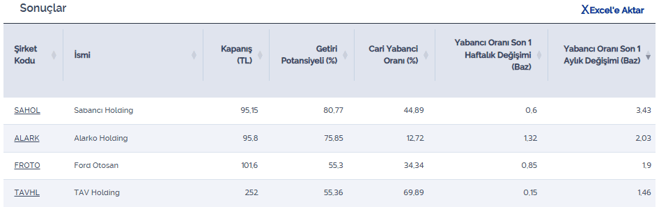 Yabancı oranı artan ve en az %55 getiri potansiyeli olan şirketler listesini aşağıda inceleyebilirsiniz.
