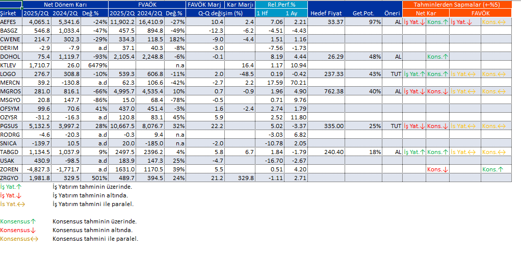 Raporun içinde ise, şu ana kadar finansallarını açıklayan BIST şirketlerini, kümüle edilerek toplanmış toplu piyasa ve sektör karlılıklarını ve piyasa tahminleri ile açıklanan finansal sonuçların karşılaştırmalı analizini bulabilirsiniz.