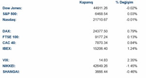 Avrupa borsaları ise günü pozitif bir seyirle tamamladı. Almanya’nın DAX endeksi %0,7935 artışla 24.377,5 puandan, İngiltere’nin FTSE 100 endeksi %0,1310 artışla 9.177,24 puandan, Fransa’nın CAC 40 endeksi %0,8375 artışla 7.870,34 puandan ve İspanya’nın IBEX endeksi %1,2417 artışla 15.206,4 puandan kapandı.