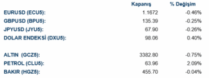 Güçlenen dolar ve yükselen tahvil faizleri, değerli metaller üzerinde satış baskısı oluşturdu. Ons Altın  %0,69’luk bir düşüşle 3.384,7 Dolar seviyesinden kapandı. Ons Gümüş ise daha sert bir düşüşle %1,48 değer kaybederek 38,03 Dolar seviyesine geriledi. Petrol fiyatları ise arz-talep endişelerinin hafiflemesiyle toparlandı. WTI Ham Petrol vadeli kontratları %2,20 artışla varil başına 64,03 Dolar’dan, Brent Petrol ise %1,98 artışla 66,93 Dolar’dan alıcı buldu. Sanayi metallerinde ise karışık bir seyir hakimdi. LME Bakır %0,3774 düşüşle ton başına 9.766 Dolar’dan, LME Alüminyum %0,1338 artışla 2.619,5 Dolar’dan ve LME Çinko %0,6893 artışla 2.848,5 Dolar’dan işlem gördü.