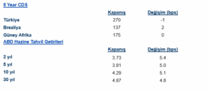 ABD’de beklentilerin üzerinde gelen ÜFE verisi, tahvil piyasalarında faizlerin yükselmesine neden oldu. Enflasyonun kalıcı olabileceği endişesiyle yatırımcılar, Fed’in faiz indirimlerinde daha temkinli davranacağını fiyatlamaya başladı. Bu durum, ABD Hazine tahvil getirilerinde eğri boyunca yükselişe yol açtı. Benzer şekilde, Avrupa devlet tahvili getirilerinde de artışlar gözlendi. ABD Hazine tahvili getirileri, enflasyonist baskıların arttığını gösteren verilerle birlikte yükseldi. 2 yıllık Hazine tahvili getirisi 5,38 baz puan artarak %3,7293 seviyesine ulaştı. 5 yıllık getiriler 5,03 baz puan artışla %3,8128’e, 10 yıllık getiriler 5,13 baz puan artışla %4,2858’e ve 30 yıllık getiriler 4,78 baz puan artışla %4,8741 seviyesine çıktı. Gelişmekte olan ülkelere yönelik risk algısında ise karışık bir seyir izlendi. Türkiye’nin 5 yıllık CDS primi 0,61 baz puan düşerek 269,51 seviyesine gerilerken, Brezilya’nın CDS’i 1,50 baz puan artarak 136,93’e, Güney Afrika’nınki ise 0,39 baz puan artarak 174,67’ye yükseldi.