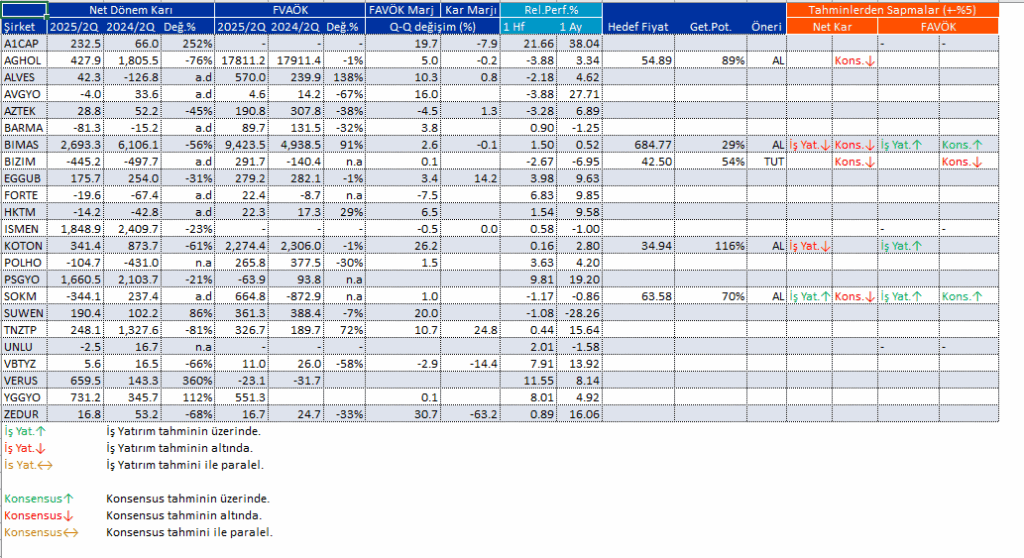 Raporun içinde ise, şu ana kadar finansallarını açıklayan BIST şirketlerini, kümüle edilerek toplanmış toplu piyasa ve sektör karlılıklarını ve piyasa tahminleri ile açıklanan finansal sonuçların karşılaştırmalı analizini bulabilirsiniz.