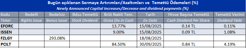 Sermaye Artırımları/Azaltımları ve Temettü Ödemeleri 15/08/2025
