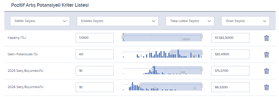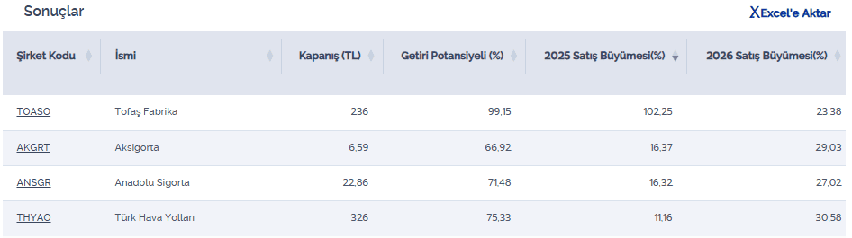 %60 üzeri getiri potansiyeli olan ve 2025&26 yıllarında minimum %10 satış büyümesi beklenen şirketler listesini aşağıda inceleyebilirsiniz.
