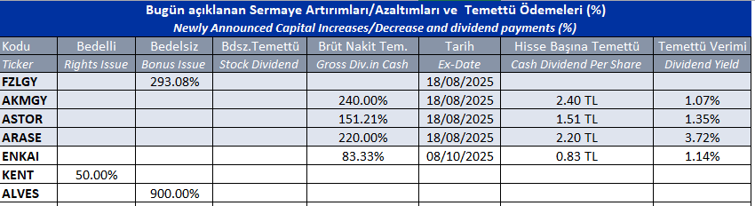 Sermaye Artırımları/Azaltımları ve Temettü Ödemeleri 18/08/2025