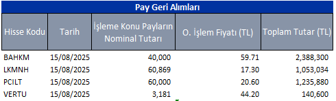 Pay geri alım programları kapsamında ilgili tarihte geri alım yapan şirketlerin listesini aşağıdaki tabloda bulabilirsiniz.