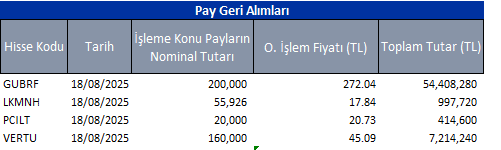 Pay geri alım programları kapsamında ilgili tarihte geri alım yapan şirketlerin listesini aşağıdaki tabloda bulabilirsiniz.