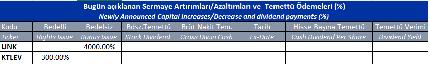 Gün içinde çıkmış veya bu sabah seans açılmadan önce açıklanmış sermaye artırımları ve temettü ödemeleri aşağıdaki tabloda görüntülenmektedir.