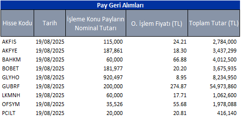 Pay geri alım programları kapsamında ilgili tarihte geri alım yapan şirketlerin listesini aşağıdaki tabloda bulabilirsiniz.