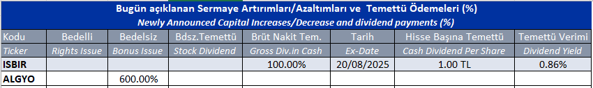 Gün içinde çıkmış veya bu sabah seans açılmadan önce açıklanmış sermaye artırımları ve temettü ödemeleri aşağıdaki tabloda görüntülenmektedir.