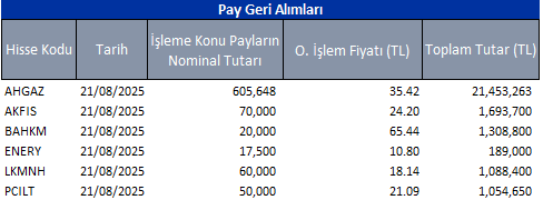 Pay geri alım programları kapsamında ilgili tarihte geri alım yapan şirketlerin listesini aşağıdaki tabloda bulabilirsiniz.
