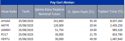 Pay geri alım programları kapsamında ilgili tarihte geri alım yapan şirketlerin listesini aşağıdaki tabloda bulabilirsiniz.