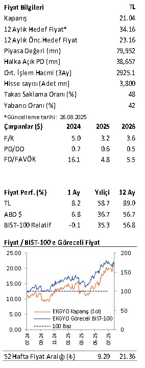 Güncellenen makroekonomik varsayımlarımız ve 2025 yılının ikinci çeyrek sonuçlarını yansıtarak, Emlak Konut GYO için hedef fiyatımızı 23,16 TL’den 34,16 TL’ye revize ediyor, %62 yukarı potansiyele işaret eden AL tavsiyemizi yineliyoruz. 2025 yılının ikinci yarısında politika faizinde düşüş trendi ve daha uygun makroekonomik koşullar ile birlikte, Emlak Konut GYO’nun artan konut talebini karşılamada ve satış gelirlerini artırmada stratejik olarak iyi konumlandığını düşünüyoruz. Şirketin geniş ve katma değerli proje portföyü ile konut stoku bu görünümü desteklemektedir. Kentsel dönüşüm projelerinde önemli bir rol üstlenen Emlak Konut Proje Planlama İnşaat (EPP) ile Emlak Konut Asansör’ün (EKA) potansiyel halka arzları önemli katalizörler arasında yer alırken, şirketin uluslararası alandaki artan faaliyetleri önümüzdeki yıllarda kârlılığı olumlu etkileyebilir. Ayrıca, konut projelerinden sağlanan istikrarlı nakit akımı sayesinde, 2025 yılında yürürlüğe giren yeni GYO vergi düzenlemesine şirketin sorunsuz şekilde uyum sağlayacağını ve önümüzdeki yıllarda güçlü bir temettü hissesi haline geleceğini öngörüyoruz. Halihazırda hisse, net aktif değerine göre %31 iskontolu işlem görmekte olup bu oran tarihsel iskontosu olan %19’un oldukça altındadır.