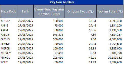 Pay geri alım programları kapsamında ilgili tarihte geri alım yapan şirketlerin listesini aşağıdaki tabloda bulabilirsiniz.