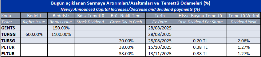 Sermaye Artırımları/Azaltımları ve Temettü Ödemeleri 28/08/2025