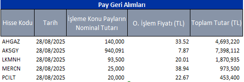 Pay geri alım programları kapsamında ilgili tarihte geri alım yapan şirketlerin listesini aşağıdaki tabloda bulabilirsiniz.