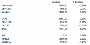 Avrupa borsaları da günü sert düşüşlerle tamamladı. DAX endeksi %2,29 azalışla 23487.33, FTSE 100 endeksi %0,87 azalışla 9116.69, CAC 40 endeksi %0,70 azalışla 7654.25 ve IBEX endeksi %1,57 azalışla 14704.20 puandan kapandı. Birleşik Krallık’ta uzun vadeli tahvil faizlerinin 1998’den bu yana en yüksek seviyeye ulaşması piyasalar üzerinde ek baskı yarattı. FTSE 100 endeksinde enerji %0,57 ve sağlık %0,22 artışla en iyi performansı sergilerken, altyapı %1,85 ve sanayi %1,72 düşüşle en kötü performansı gösteren sektörler oldu. DAX endeksinde en az düşüş gösteren sektörler %0,29 ile iletişim servisleri ve %0,35 ile temel tüketim olurken, gayrimenkul %6,06 ve bilgi teknolojileri %3,12 düşüşle en sert değer kaybeden sektörler olarak kaydedildi.