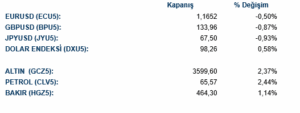 COMEX’te Ons Altın fiyatı %2,33 artışla 3597.9 dolardan işlem görürken, Ons Gümüş de %2,30’luk bir yükselişle 41.66 dolara ulaştı. Brent petrol vadeli kontratları günü %1,50 artışla varil başına 69.17 dolardan tamamladı. LME piyasasında ise endüstriyel metaller genel olarak pozitif bir gün geçirdi; Bakır %0,98 artışla 9980.5 dolardan, Alüminyum %0,31 artışla 2619 dolardan ve Çinko %1,15 artışla 2865 dolardan işlem gördü.