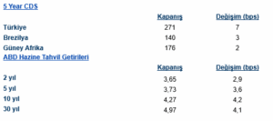 Küresel tahvil piyasalarında, artan kurumsal borç arzı ve gelişmiş ülkelerdeki bütçe açığı endişeleriyle sert bir satış dalgası yaşandı. Bu durum, özellikle uzun vadeli tahvil faizlerinde belirgin bir yükselişe neden oldu. ABD 30 yıllık Hazine tahvil getirisi %5 sınırına yaklaşırken, 30 yıl ile 2 yıl arasındaki getiri farkı 2022 başından bu yana en geniş seviyesine ulaştı. Bu “ayı dikleşmesi” (bear steepening) olarak adlandırılan durum, yatırımcıların kısa vadede faiz indirimleri beklerken uzun vadede enflasyon, ekonomik zayıflık ve kamu borçluluğu konularında endişeli olduğuna işaret etti. Satış dalgası sadece ABD ile sınırlı kalmadı; Birleşik Krallık’ta uzun vadeli tahvil getirileri 1998’den bu yana en yüksek seviyeye çıkarken, Almanya’da da 10 yıllık tahvil faizleri yükseldi. Küresel risk algısındaki bozulmaya paralel olarak gelişmekte olan ülke risk primlerinde artış gözlendi. Türkiye’nin 5 yıllık CDS primi 6.51 baz puan artarak 271.10 seviyesine yükseldi. Brezilya’nın CDS’i 2.70 baz puan artışla 139.56’ya, Güney Afrika’nınki ise 1.61 baz puan artışla 176.31 seviyesine çıktı. ABD Hazine tahvillerinde ise getiri eğrisi boyunca yükselişler kaydedildi. 2 yıllık tahvilin getirisi 2.86 baz puan artışla %3.6464’e, 5 yıllık tahvilin getirisi 3.64 baz puan artışla %3.7331’e, 10 yıllık tahvilin getirisi 4.17 baz puan artışla %4.2721’e ve 30 yıllık tahvilin getirisi 4.07 baz puan artışla %4.9691’e ulaştı.