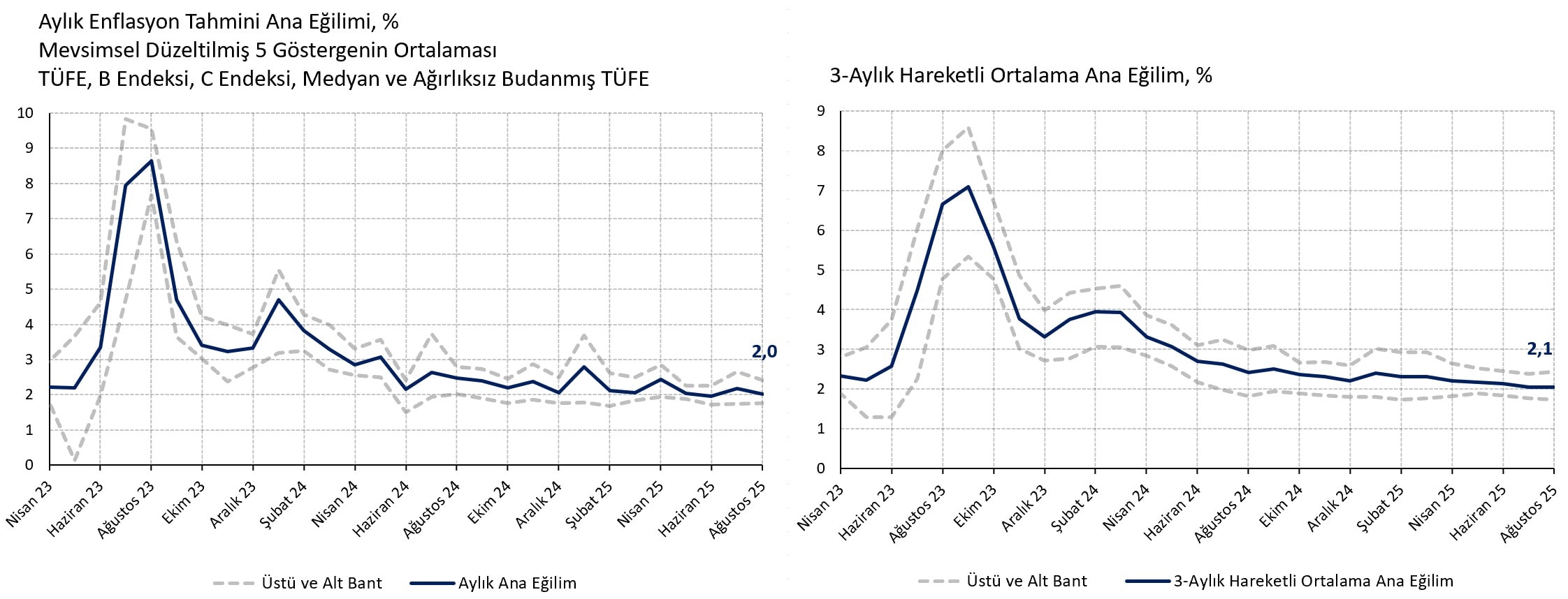 Enflasyonun genel gidişatına dair uç değerler, oynaklıklar ve mevsimsellikten arınmış bir özet gösterge oluşturmak adına 5 mevsimsel düzeltilmiş göstergenin ortalamasını (TÜFE, çekirdek B ve C endeksleri, medyan, ağırlıksız ortalama budanmış TÜFE) alıyoruz. Ağustos ayı için, söz konusu tahmini ana eğilimi aylık %2,05 (Temmuz %2,2, Haziran %2,0, Mayıs %2,0) ile uzun süredir takıldığı sınırın üzerinde buluyoruz. Tahmini ana eğilimin 3-aylık hareketli ortalaması da %2,1 (Temmuz %2,1, Haziran %2,1, Mayıs %2,2) düzeyinde yatay seyrediyor. Ana eğilimin yılın son çeyreğinde %1,7-%1,8 civarına inmesini beklesek de veriler katılık riskinin yüksek olduğunu, %19,5 düzeyindeki 2026 sonu enflasyon tahminimizin iyimser kaldığını söylüyor.
