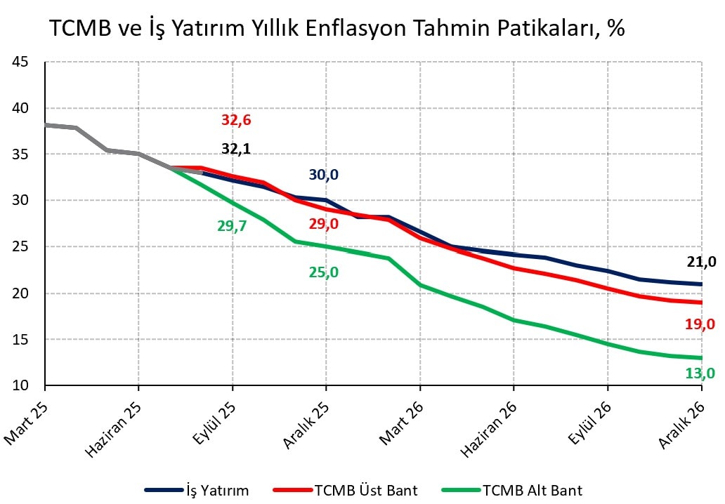 Gıda sürprizi ve ana eğilimdeki yatay seyir sonrası 2025 sonu enflasyon tahminimizi %29,5’ten %30,0, 2026 sonu tahminimizi %19,5’ten %21,0 seviyesine yükseltiyoruz. Enflasyon beklentilerimiz Türkiye Cumhuriyet Merkez Bankası’nın (TCMB) 2025 (%25-%29) ve 2026 (%13-%19) yıl sonu tahmin aralıklarının üzerinde.