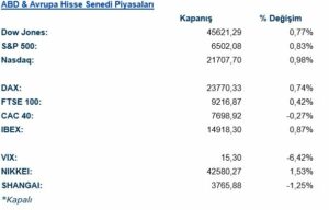 Fed Başkanı Jerome Powell’ın “değişen risk dengesi” söylemi ve Fed yetkilisi Christopher Waller’ın iş gücü piyasasındaki zayıflama risklerine karşı birden fazla faiz indiriminin gerekebileceğine dair açıklamaları, piyasadaki faiz indirimi beklentilerini destekleyen önemli unsurlar oldu. ABD endeksleri günü alıcılı bir seyirle tamamladı. S&P 500 endeksi yaklaşık %1’lik bir artışla rekor seviyeye ulaştı. S&P 500 endeksinde takdirsel tüketim %2.25 ve iletişim hizmetleri %1.12 artışla en iyi performansı sergileyen sektörler olurken, altyapı hizmetleri %0.16 azalış ve temel tüketim %0.09 artışla en zayıf performansı gösteren sektörler oldu. Dow Jones endeksinde finans sektörü %1.64 ve takdirsel tüketim %1.45 artışla en çok değerlenen sektörler olurken, bilgi teknolojileri %0.27 ve enerji %0.23 azalışla en çok değer kaybeden sektörler olarak kaydedildi. Nasdaq endeksinde ise iletişim hizmetleri %1.19 ve takdirsel tüketim %1.13 artışla öne çıkarken, hammadde %0.69 ve bilgi teknolojileri %0.51 azalışla negatif ayrıştı.