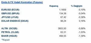 Emtia piyasasında, güçlenen dolar ve faiz beklentileri değerli metaller üzerinde baskı yarattı. Ons Altın %0.80’lik bir düşüşle gün sonunda 3,606.3 dolar seviyesinden işlem gördü. Ons Gümüş ise daha sert bir kayıpla %1.72 oranında gerileyerek 41.335 dolardan kapandı. Petrol fiyatları, küresel ekonomik yavaşlama endişeleriyle geriledi; Brent petrol %1.17 düşüşle varil başına 66.81 dolardan alıcı buldu. Sanayi metallerinde de zayıf bir seyir izlendi; LME Bakır %0.78 düşüşle ton başına 9,898 dolara, LME Alüminyum %1.05 düşüşle 2,591.5 dolara ve LME Çinko %0.61 düşüşle 2,843.5 dolara geriledi.