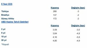 ABD iş gücü piyasasının soğuduğuna işaret eden verilerin ardından Fed’in yakın zamanda faiz indirimine gideceği beklentilerinin artması, ABD Hazine tahvillerine yönelik güçlü bir talep yarattı. Tahvil fiyatları yükselirken getirilerde belirgin bir düşüş yaşandı. Bu hareket, yatırımcıların merkez bankasının ekonomik yavaşlamaya karşı parasal gevşemeye gideceğini fiyatladığını göstermektedir. ABD Hazine tahvil getirilerinde ise tüm vadelerde düşüş hakimdi. 2 yıllık tahvil getirisi 2.68 baz puan azalışla %3.59’a, 5 yıllık getiri 4.50 baz puan azalışla %3.65’e ve 10 yıllık getiri 5.22 baz puan azalışla %4.17’ye geriledi. 30 yıllık tahvil getirisi de 3.75 baz puan düşerek %4.86 oldu. Almanya 2 yıllık Hazine tahvil getirisi 0.4 baz puan yükselişle %1.958, 5 yıllık tahvil getirisi 1 baz puan düşüşle %2.266, 10 yıllık tahvil getirisi ise 2.1 baz puan düşüşle %2.716 seviyelerinde günü tamamladı. Gelişmekte olan piyasalara yönelik risk algısında iyileşme gözlendi. Türkiye’nin 5 yıllık CDS primi 3.04 baz puan düşerek 268.34 seviyesine geriledi.