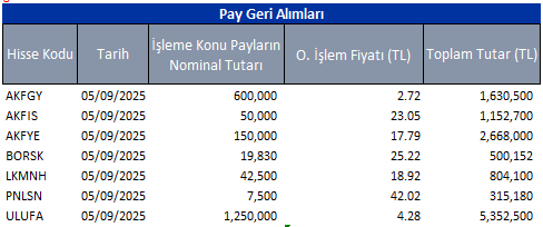 Pay geri alım programları kapsamında ilgili tarihte geri alım yapan şirketlerin listesini aşağıdaki tabloda bulabilirsiniz.