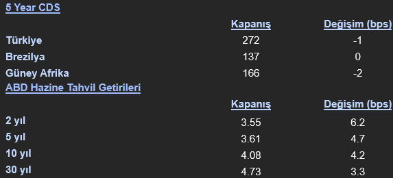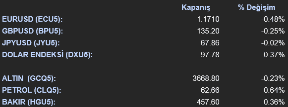 Döviz piyasalarında, ABD tahvil getirilerindeki yükselişin etkisiyle Dolar Endeksi (DXU5) %0.37 artışla 97.77 seviyesine yükseldi. Bu durum, diğer majör para birimleri üzerinde baskı yarattı. EUR/USD (ECU5) paritesi %0.48 düşüşle 1.171 seviyesinden işlem gördü. Emtia tarafında ise Altın vadeli kontratları dolardaki güçlenmeye paralel olarak %0.23 düşüşle 3,668.9 dolardan günü tamamlarken, gümüş %1.27’lik belirgin bir düşüşle 41.37 dolara geriledi. WTI Petrol (CLQ5) vadeli kontratları İsrail’in Katar’a düzenlediği saldırının ardından Orta Doğu’daki gerilimin tırmanabileceği endişeleriyle %0.64 artışla 62.66 dolardan işlem gördü. Brent petrol 66.41 dolardan kapanırken, gün içinde %0.59’luk bir artış kaydetti. Londra Metal Borsası’nda (LME) işlem gören metallerden bakır 9,914 dolardan neredeyse yatay bir seyirle (%0.01 düşüş) günü tamamlarken, alüminyum %0.19 artışla 2,622.5 dolara, çinko ise %0.71 düşüşle 2,856 dolara geriledi.