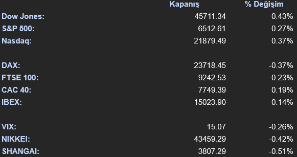 Bu beklentilerle ABD endeksleri günü pozitif sonlandırdı. Dow Jones endeksi %0.43 artışla 45,711.34 puandan, S&P 500 endeksi %0.27 artışla 6,512.61 puandan ve Nasdaq endeksi %0.37 artışla 21,879.49 puandan kapanış yaptı. S&P 500 endeksinde en iyi performansı %1.64 artışla iletişim servisleri ve %0.71 artışla altyapı sektörleri sergilerken, hammadde %1.57 ve sanayi %0.65 oranında düşüşle en zayıf performansı gösteren sektörler oldu.