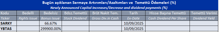 Gün içinde çıkmış veya bu sabah seans açılmadan önce açıklanmış sermaye artırımları ve temettü ödemeleri aşağıdaki tabloda görüntülenmektedir.