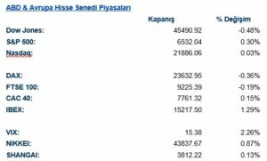ABD endeksleri günü karışık bir seyirle tamamladı. S&P 500 endeksi %0.30 artışla 6,532.04 puandan kapanırken, endekste en iyi performansı %1.76 ile enerji ve %1.75 ile bilgi teknolojileri sektörleri sergiledi; en zayıf performans ise %1.57 düşüşle takdirsel tüketim ve %1.06 düşüşle temel tüketim sektörlerinde görüldü. Dow Jones endeksi %0.48 oranında bir azalışla 45,490.92 puana geriledi; endekste %1.87 artışla enerji en iyi performansı gösterirken, %1.55 ile takdirsel tüketim ve %1.10 ile iletişim hizmetleri en çok değer kaybeden sektörler oldu. Nasdaq endeksi ise %0.03’lük sınırlı bir artışla 21,886.06 puandan günü tamamladı.