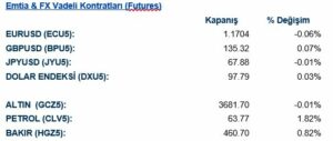 Ons Altın (GCZ5), 3,681.7 dolardan %0.01’lik çok sınırlı bir düşüşle işlem görürken, Ons Gümüş ise %0.76 oranında değer kazanarak 41.655 dolar seviyesinden kapandı. Brent petrol %1.81 artışla varil başına 67.59 dolardan işlem gördü. Sanayi metallerinde de pozitif bir seyir vardı; LME Bakır %1.00 primlenerek ton başına 10,013 dolara, LME Alüminyum %0.10 artışla 2,625 dolara ve LME Çinko %1.07 değer kazanarak 2,886.5 dolara ulaştı.
