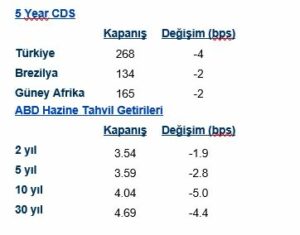 Gelişmekte olan piyasalara yönelik risk algısında iyileşme gözlemlendi. Türkiye’nin 5 yıllık CDS primi 3.76 baz puanlık bir düşüşle 267.88 seviyesine gerilerken, Brezilya’nın CDS’i 2.44 baz puan düşüşle 134.36’ya ve Güney Afrika’nın CDS’i 1.60 baz puan düşüşle 164.96 seviyesine indi. Türkiye Hazine 2 yıllık tahvil getirisi 2.4 baz puan düşüşle %4.74, 5 yıllık tahvil getirisi 3.6 baz puan düşüşle %5.89, 10 yıllık tahvil getirisi 4.2 baz puan düşüşle %6.77 seviyesinde günü tamamladı.