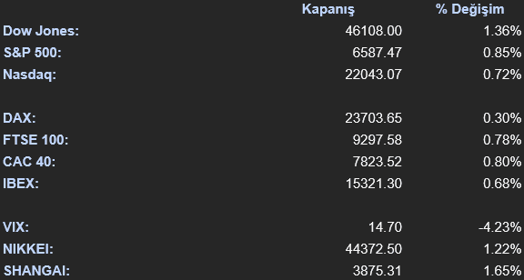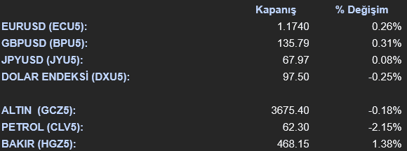 ABD’de Fed’in faiz indirimine gideceği beklentilerinin güçlenmesiyle Dolar Endeksi (DXU5) zayıfladı ve günü %0.25’lik bir düşüşle 97.505 seviyesinden kapattı. Bu gelişme, majör para birimlerini dolar karşısında destekledi. EURUSD paritesi (ECU5) %0.26 artışla 1.1739 seviyesine, GBPUSD paritesi (BPU5) ise %0.31 artışla 135.79 seviyesine yükseldi. Emtia tarafında, ons altın %0.18’lik hafif bir düşüşle 3675.20 dolardan işlem gördü, ons gümüş ise %1,23’lük bir artışla 42.12 dolardan kapanış yaptı. Ham Petrol (CLV5), zayıflayan talep endişeleri ve enerji sektöründeki genel düşüşe paralel olarak %2.17 değer kaybederek varil başına 62.29 dolara geriledi. Brent petrol, WTI petrole paralel bir hareketle %1.78 düşüşle 66.29 dolardan işlem gördü. Londra Metal Borsası’nda (LME) endüstriyel metallerde alıcılı bir seyir hakimdi. LME Bakır %0.38 artışla 10051.5 dolara, LME Alüminyum %1.85 artışla 2673.5 dolara ve LME Çinko %0.47 artışla 2900 dolara yükseldi.