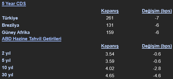 ABD’de zayıflayan iş gücü piyasası verileri ve artan faiz indirimi beklentileri, devlet tahvillerine olan talebi artırdı ve getirilerde düşüşe neden oldu. Özellikle ABD 10 yıllık tahvil getirisi 4.02% seviyesine gerileyerek önemli bir eşiği test etti. Avrupa tahvil piyasalarında da benzer bir eğilim gözlendi; İngiltere 10 yıllık tahvil getirisi düşerken, Almanya 10 yıllık tahvil getirisinde sınırlı bir değişim yaşandı. Gelişmekte olan piyasalara yönelik risk algısında genel bir iyileşme gözlendi. Türkiye’nin 5 yıllık CDS primi 7.40 baz puanlık düşüşle 260.54 seviyesine gerilerken, Brezilya CDS’i 5.91 baz puan düşüşle 130.90’a ve Güney Afrika CDS’i 5.92 baz puan düşüşle 158.83’e indi. ABD Hazine tahvil getirilerinde ise eğri genelinde düşüşler yaşandı. 2 yıllık tahvil getirisi 0.64 baz puan düşüşle %3.54, 5 yıllık getiri 0.61 baz puan düşüşle %3.59, 10 yıllık getiri 2.77 baz puan düşüşle %4.02 ve 30 yıllık getiri 4.64 baz puan düşüşle %4.65 seviyesinden günü tamamladı.