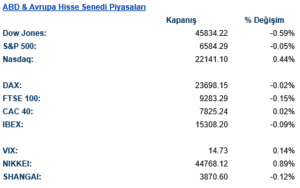 ABD endeksleri günü karışık bir seyirle tamamladı. Dow Jones endeksi %0,59 azalışla 45834 puandan, S&P 500 endeksi ise %0,05’lik hafif bir düşüşle 6584 puandan kapandı. S&P 500 endeksinde altyapı %0.56 ve bilgi teknolojileri %0.45 artışla en iyi performansı sergilerken, sağlık %1.13 ve sanayi %0.82 düşüşle en zayıf performansı gösteren sektörler oldu. Teknoloji odaklı Nasdaq endeksi ise %0,44 artışla 22141 puana yükselerek pozitif ayrıştı.
