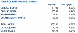 Dolar Endeksi , günü %0,07’lik sınırlı bir artışla 97.60 seviyesinden tamamladı. EURUSD paritesi ise %0,02 oranında hafif bir değer kaybıyla 1.179 seviyesinden işlem gördü. Fed’in faiz indirimine başlayacağı beklentisiyle Ons Altın %0,25 artışla 3682 dolar seviyesine yükseldi. Değerli metallerden Ons Gümüş, %1.39 oranında belirgin bir artışla 42.735 dolardan alıcı buldu. WTI Ham Petrol vadeli kontratları %0,29 primlenerek günü varil başına 62.55 dolardan kapattı. Brent petrol ise %0.68 artış göstererek 66.82 dolardan kapandı. Sanayi metallerinde LME Bakır %0.16 artışla 10067 dolara, LME Alüminyum %0.60 artışla 2689.5 dolara ve LME Çinko %1.97 artışla 2957 dolara yükseldi.