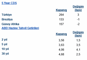 ABD tahvilleri güçlü performans gösterdiği haftayı, son işlem günü itibariyle satıcılı kapadı. Beklentilerin altında kalan Michigan Üniversitesi ekonomi güveni verisi ve beklenti üstünde gelen uzun vadeli enflasyon tahmini tahvillerdeki satış baskısını artırdı. Önümüzdeki hafta gerçekleşecek Fed toplantısı öncesinde yıl sonuna kadar üç adet 25 baz puanlık faiz indirimi yaklaşık %80 ihtimal ile fiyatlanıyor. Swap fiyatlamalarına göre dün üç faiz indirimi %100 ihtimal ile fiyatlanıyordu. Gelecek Fed toplantısında, çeyreklik açıklanan noktasal tahminler ve Fed’in ekonomik tahminleri yakından takip edilecek. ABD tahvilleri bugünkü zayıf performansa rağmen üst üste dört haftayı alıcılı kapadı. Avrupa tahvilleri de satıcılı bir günü geride bıraktı. Almanya 10 yıllık getirileri 6 baz puan yükselerek %2.713, Fransa 10 yıllıkları 6.6 baz puan yükselerek % 3.505 seviyesinden işlem gördü. Fransa-Almanya 10 yıllık getiri makası 78 baz puan oldu. Gelişmekte olan ülkelere yönelik risk algısı karışık bir seyir izledi. Türkiye’nin 5 yıllık CDS primi 3.45 baz puan artışla 264 seviyesine yükselirken, Brezilya’nın CDS primi 0.84 baz puan düşüşle 132 seviyesine ve Güney Afrika’nınki 1.54 baz puan düşüşle 156 seviyesine geriledi. Türkiye 2 yıllık hazine Eurotahvil getirisi 4.4 baz puan yükselirken, 10 yıllıklar 6.2 baz puan yükseldi.